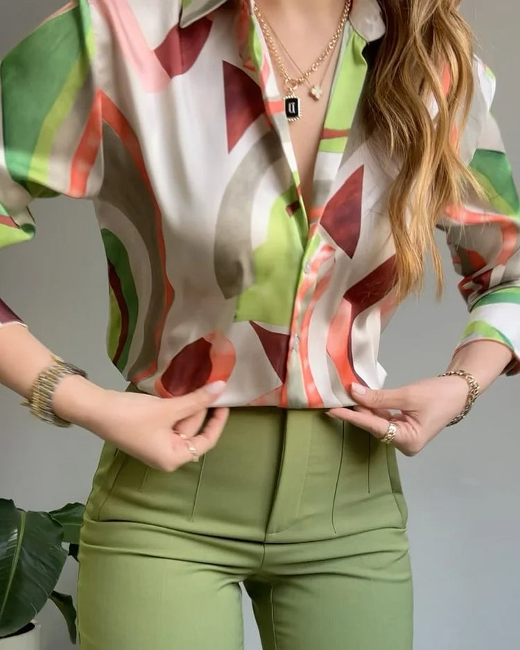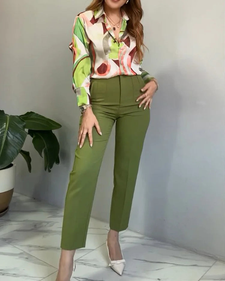 Conjunto de Camisa Estampada de Manga Larga y Pantalón Verde Ajustado con Pinzas