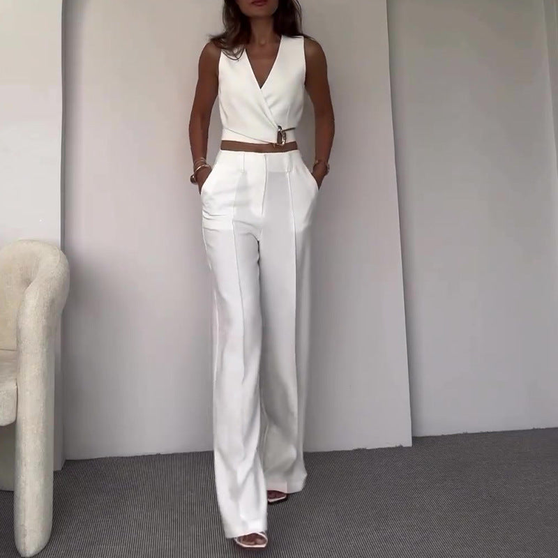 Conjunto elegante de dos piezas con corte cruzado y pantalón recto