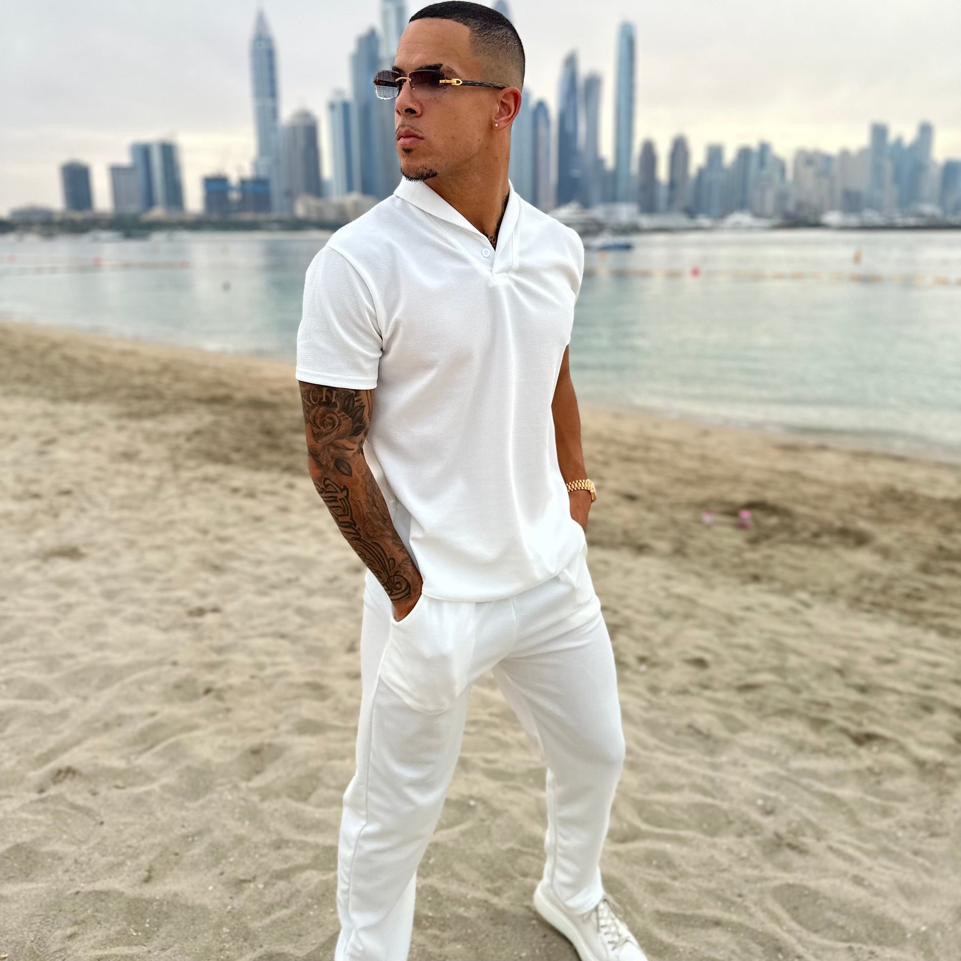 Explora el equilibrio perfecto entre funcionalidad y estilo con nuestro conjunto deportivo veraniego para hombre. Este traje informal incluye una camiseta de manga corta con solapa y unos pantalones largos con cintura elástica y cordón ajustable, ideal para mantenerse cómodo y fresco durante tus actividades diarias.