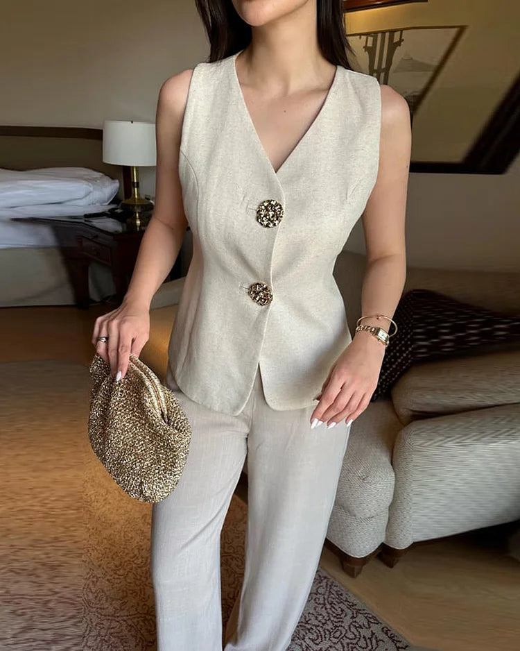 Conjunto Genoveva de Dos Piezas: Chaleco con Botones y Pantalón en Color Liso