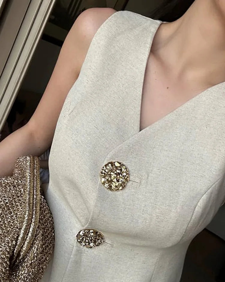 El chaleco con botones acentúa tu figura con su corte ajustado y su diseño sin complicaciones, mientras que el pantalón de color liso completa el look con una silueta limpia y contemporánea. Ideal para ocasiones especiales o para destacar en el día a día con un toque de distinción.