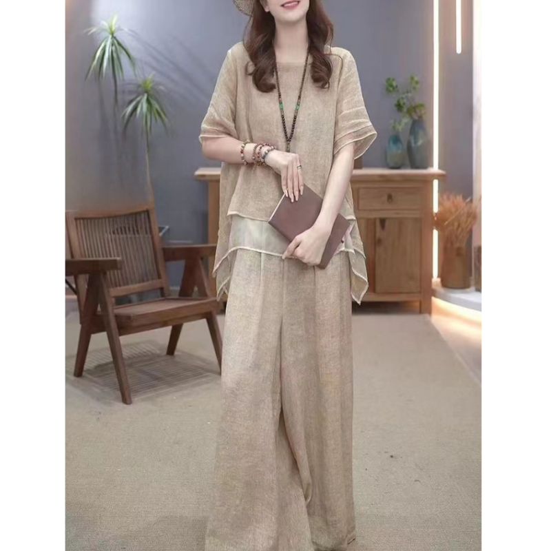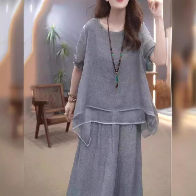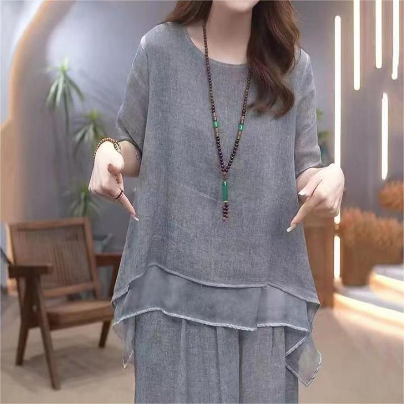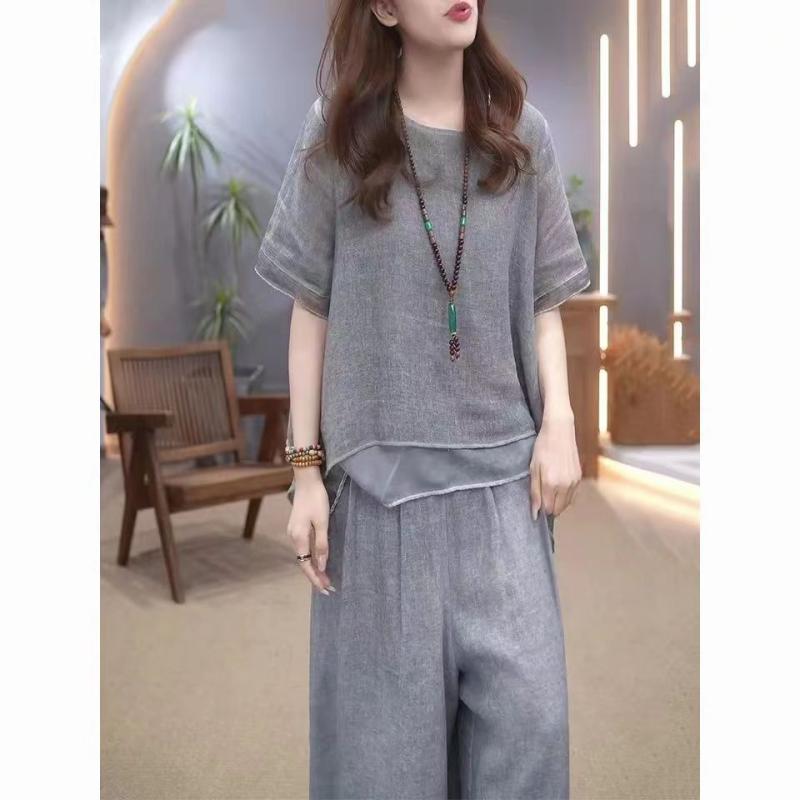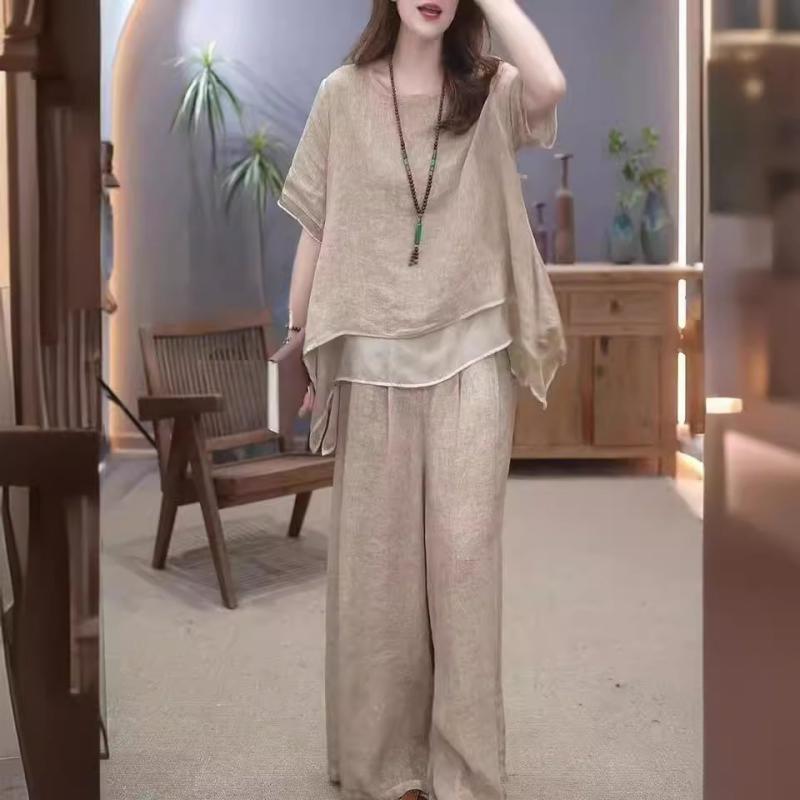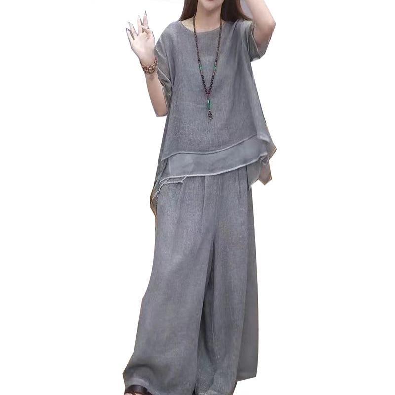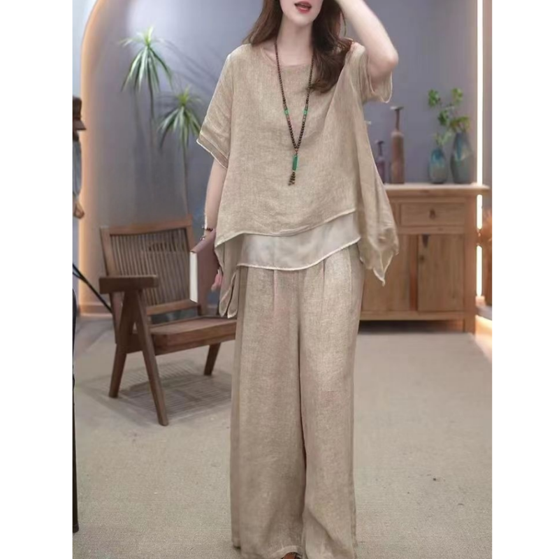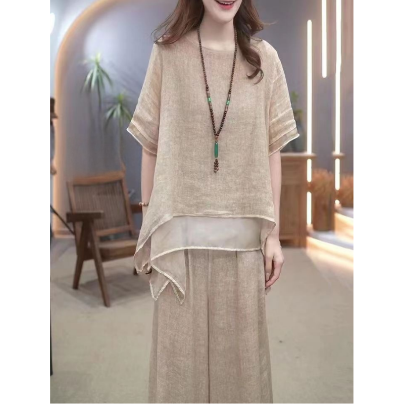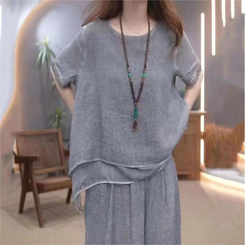 Elegante Conjunto de 2 Piezas de Lino de Algodón Suelto de Color Sólido para Mujer