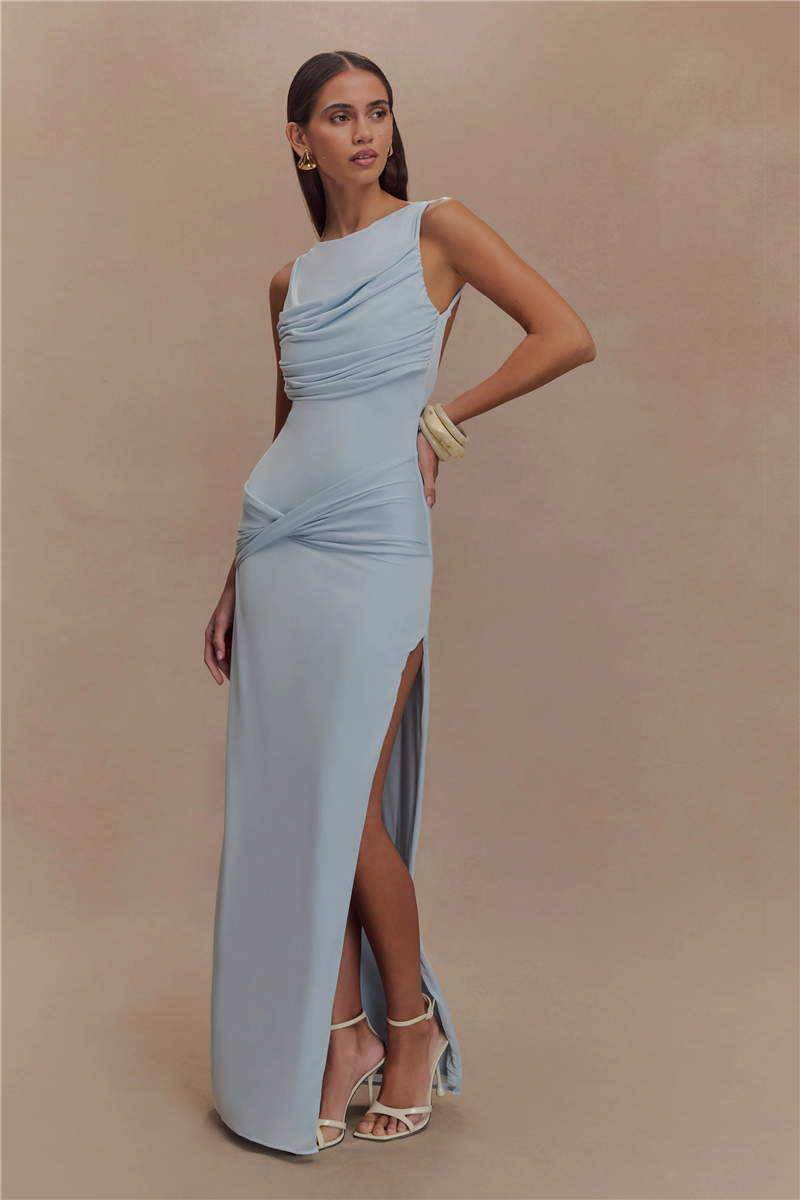 Déjate envolver por el encanto atemporal de LEONA, un vestido largo que fusiona elegancia clásica con un toque de sensualidad moderna. Su diseño sin mangas, fruncido en el pecho y con escote redondo realza la silueta de manera sutil pero poderosa. La espalda descubierta y la abertura alta en el muslo añaden un aire atrevido sin perder la sofisticación, convirtiéndolo en el look ideal para eventos de noche, galas o celebraciones donde quieras brillar.