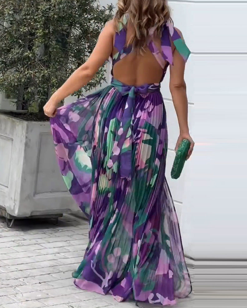 Este vestido encapsula la esencia de un jardín en plena floración con su estampado de grandes flores en tonos de violeta, verde y magenta. El diseño con escote en V profundo y cinturón incorporado acentúa la figura, mientras que la falda de corte alto y fluido añade un aire de misterio y libertad al caminar.